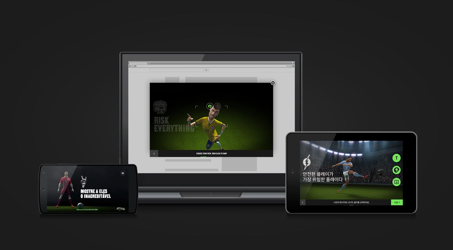 Nike's Phenomenal Shot launched globally with support for 15 different languages, on a platform that was built to react easily and quickly to the unpredictable nature of the game. Built in 3D WebGL, JavaScript, and HTML 5, the experience was made for mobile, tablet, and desktop browsers. The experience also appeared within innovative mobile and Lightbox Ad units.